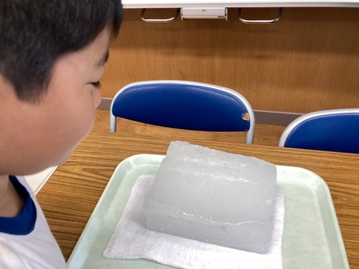 当然,始めて見る氷に興味津々です。気泡の音を聞いたり,触ったりして,いつもの氷との違いを感じ取ったようでした。