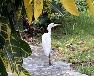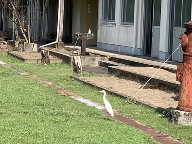ここ数日、校庭にて、捕食に励むサギ一羽です。口ばしや足の色などから、チュウサギではなかろうかと思われますが、いかがでしょうか。